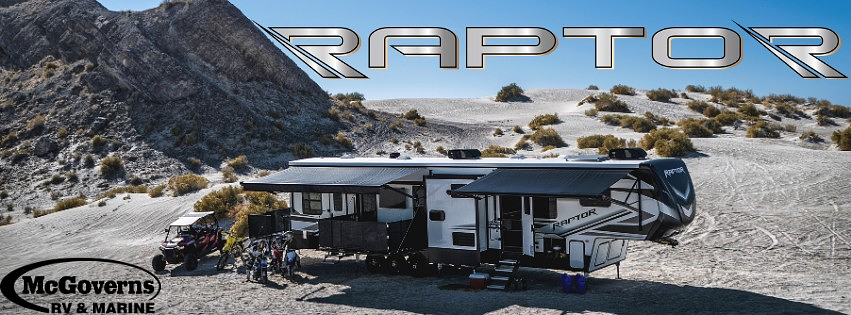 Jump all-in on your next adventure with the Raptor luxury toyhaulers. Take advantage of the party patio at the back, and utilize the garage space to take all your toys with you - conquer the unknown and make memories that you can keep with you forever. Featuring the Adjust-A-Track frame-welded tie down system that has 38 points of contact welded right into the frame that each hold 5000 lbs. The iN-Command system lets you control your RV right from your phone - from the stereo to the slides, the awnings, HVAC and more! When you're done after the best day on your dirt bike or ATV the Raptor brings you luxury in your home-on-wheels. With extensive SolarFlex options that can power things like a CPAP machine without shore power, and the 12V distribution center to prevent undesired battery draw you can stay off-grid and escape the drain of everyday life longer. When it heats up, or you're breaking a sweat from your last exhilarating (but exhausting) journey the Omni-Chill technology allows 3 AC to run concurrently to keep you cool. With a master bedroom AND loft beds, plus pull-out couches several of the Raptor RV floorplans can sleep up to seven people - meaning you don't have to leave anyone behind.